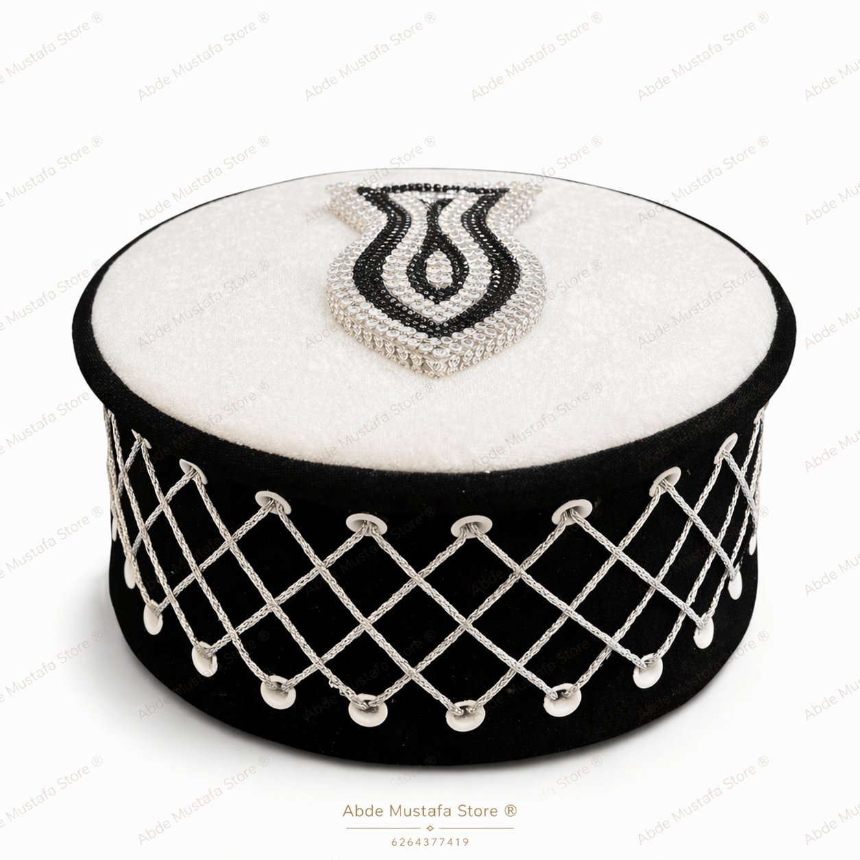 This premium Islamic cap is crafted from high-quality velvet fabric, offering a soft feel and a refined, elegant look. Designed in a stylish black and white contrast with intricate handcrafted stone detailing on the top, this cap delivers a unique and eye-catching appearance.
